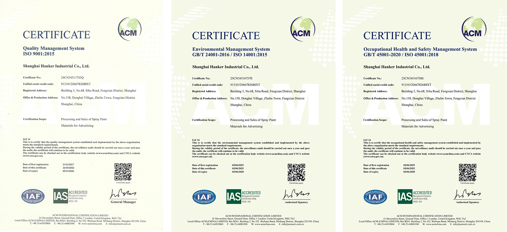 Recentemente, a Shanghai Hanker Industrial Co., Ltd. (denominada "Hanker") obteve com êxito a certificação ISO 9001: 2015 Management Sistema de Gerenciamento da Qualidade, a certificação do sistema de gerenciamento ambiental ISO 14001 e a Certificação do Sistema de Gerenciamento de Saúde e Segurança da ISO 45001 através da auditoria da ACM International Certification Limited. Essa conquista demonstra que a empresa atendeu totalmente aos padrões internacionais em controle de qualidade, proteção ambiental e segurança dos funcionários. A aquisição dessas três certificações do sistema é o resultado do compromisso de longo prazo de Hanker com o gerenciamento padronizado. Ao otimizar os processos de produção, estabelecer mecanismos de prevenção e controle de riscos ambientais e melhorar os sistemas de treinamento em saúde e segurança ocupacional, a empresa alcançou controle padronizado sobre toda a cadeia, desde a aquisição de matérias -primas até a entrega de produtos acabados. No futuro, tomando essas certificações como fundamento, Hanker aprofundará ainda mais a inovação tecnológica e a atualização da administração, promoverá ativamente a cooperação da indústria-universidade-pesquisa com as universidades, explorará aplicações de ponta no campo de materiais e contribuirá para o desenvolvimento de alta qualidade da indústria.